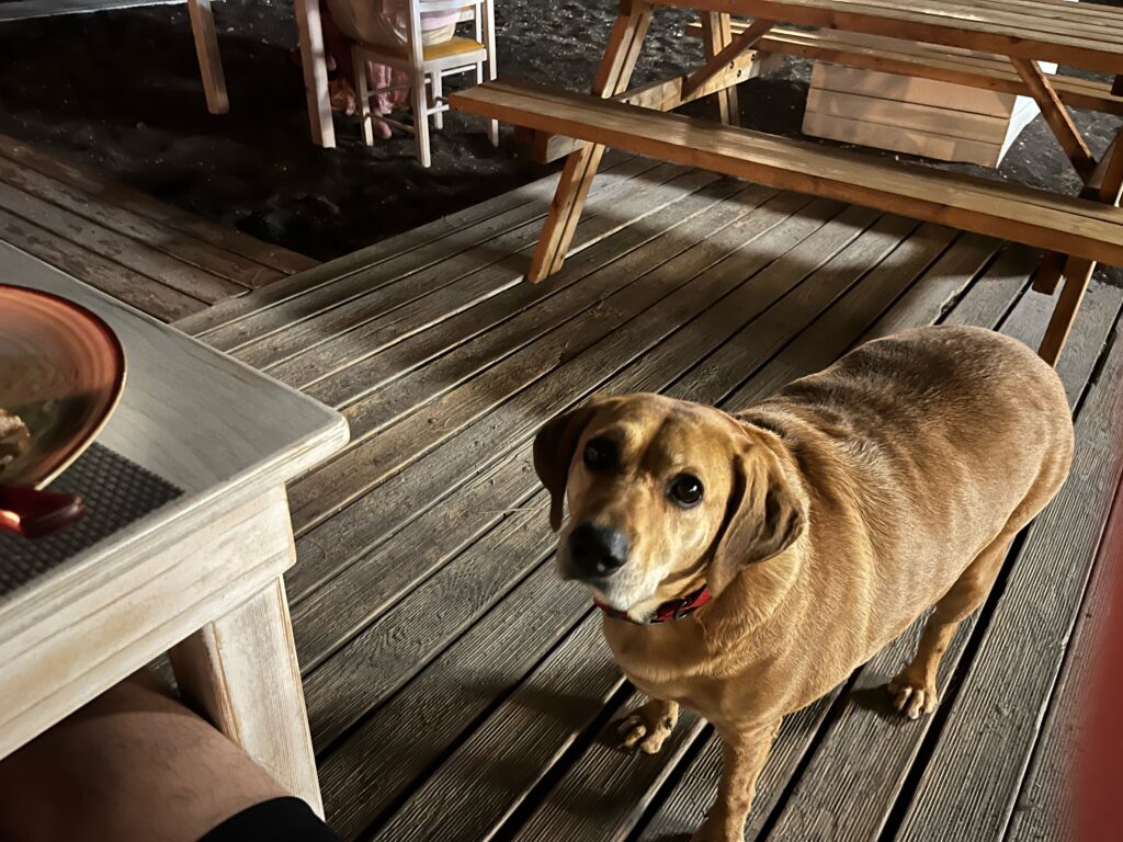近くには犬がおり、肉を食べたそうにしておりました。