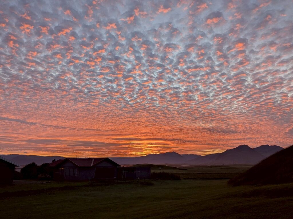 宿で夕食を済ませて、また外に出てみると日はさらに傾き、赤みが増していました。そして雲が散り散りになり、赤い光を受けて先ほどとは、全く別の表情となっています。これが夜の10時ぐらいの景色です。