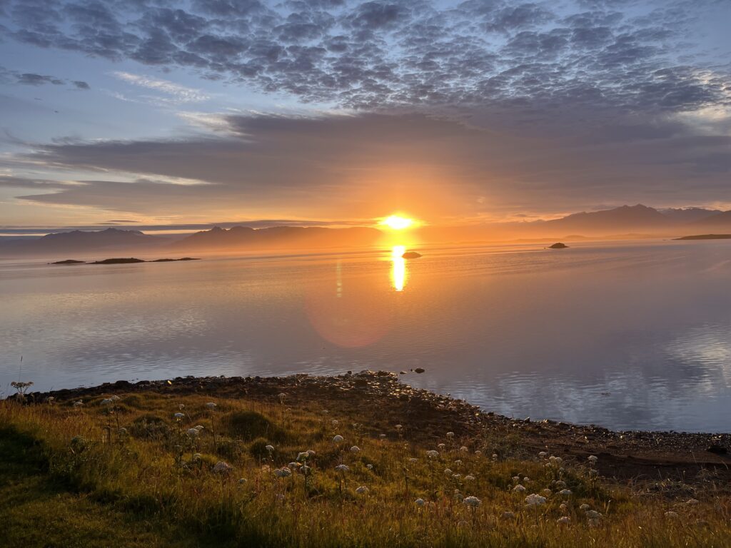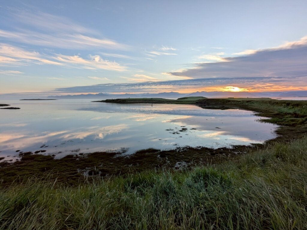 気温は、暑すぎず、寒すぎずちょうどよく、周囲には遮るものがないため360度見渡すことができます。目の前には海があり、海岸の平地にはゴルフコースが設置されているため、芝生と海の美しさが調和しています。またアイスランドには珍しく綺麗に晴れており、夕日が出ていました。