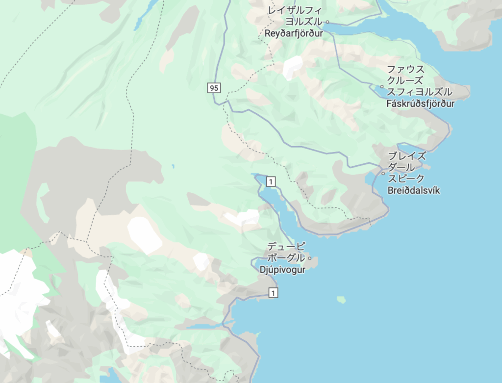 地図で言うとデューピボーグルらへんを北上する道路ですが、ここがめっちゃでかいフィヨルド地帯です。とてつもなく、でかく海岸が抉られており、過去に大きな氷河がこの地を侵食したことがわかります。