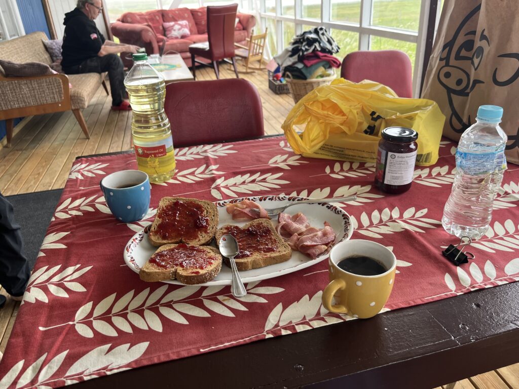 朝には、パンにストロベリージャムをたっぷり塗り、ベーコンとコーヒーと共にいただきました。自然を見ながらの食事は癒されますね。