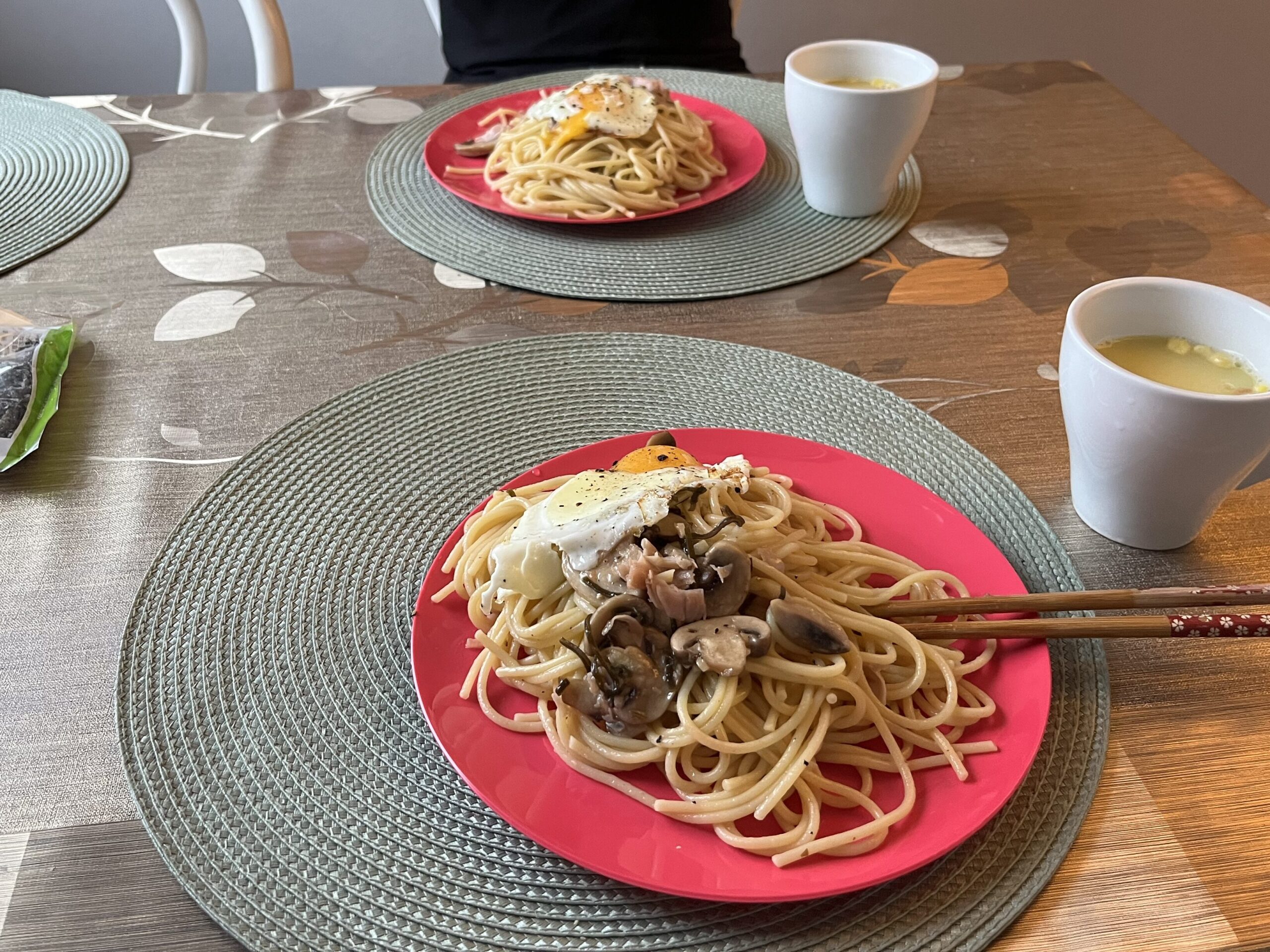 塩昆布とハムときのこパスタを作りました。味付けは、持ってきたすき焼きのタレで、めっちゃ日本ぽくて最高に美味かったです。こっちのパスタは麺が太くておそらく2.0mmぐらいあるんじゃないかと思います。この太麺にかなりハマりました。日本でもこんな太い麺が食べたいなぁ。