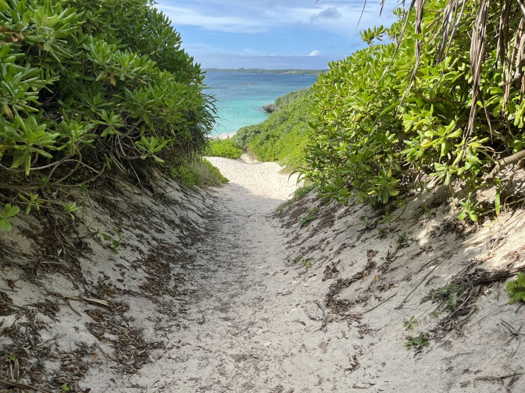 こんな細道を降りていく必要があります。道の先には海がチラ見えしていて、めっちゃワクワクする景色ではないでしょうか。