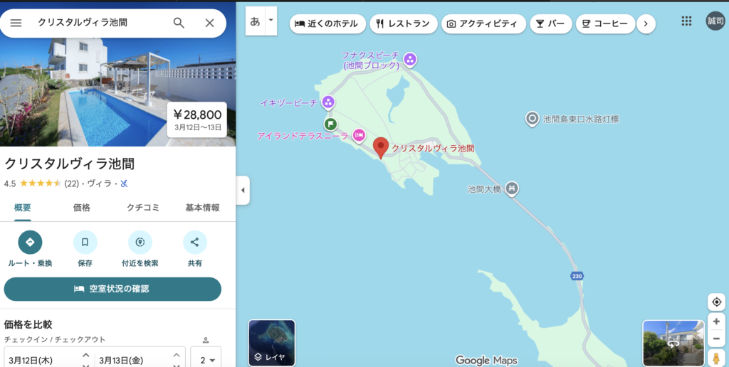 3泊目は、こちらのクリスタルヴィラ池間へ宿泊しました。島の北側に位置する池間島は、海が青く透き通っていることでも有名です。