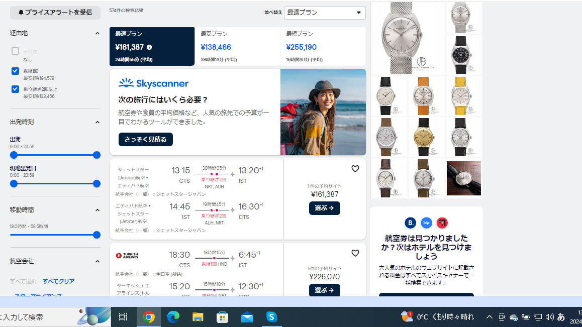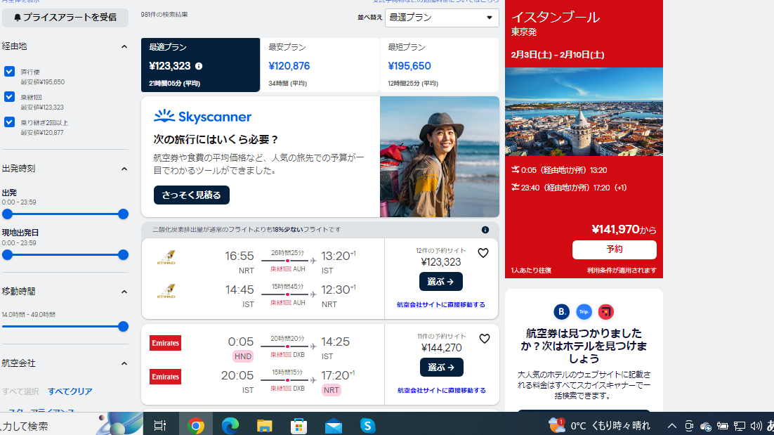 例えば千歳からイスタンブールですが、最適プランで16万近くします。最安プランは移動時間が長すぎるために比較の対象外とします。