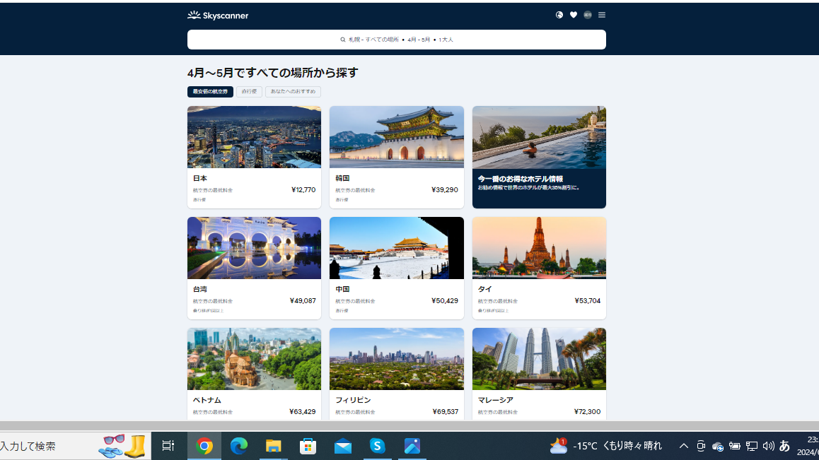 こんな感じで上から安い順に国が表示されます。この中から国を選ぶ作業がまたとても楽しいんですよ。笑 それぞれの国に思いを巡らせて、目的地を決めるときのわくわく感を味わってほしいです。