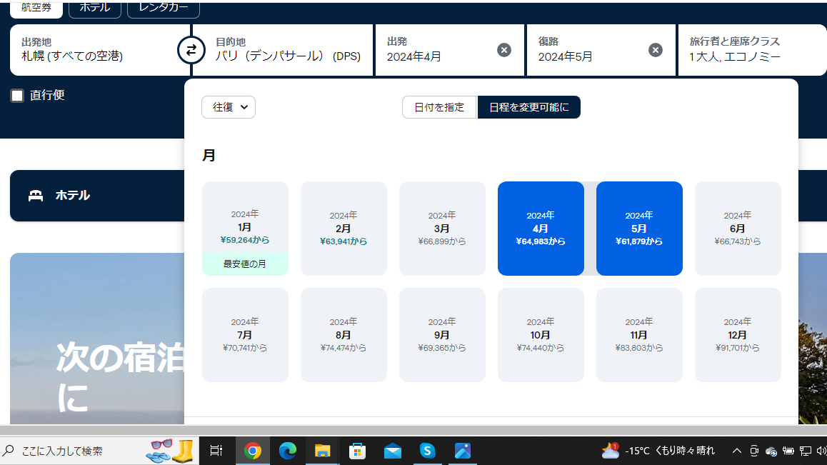公式サイトやほかの比較サイトを色々と見てきましたが、やはりこれが一番安いと考えられます。これの優れている部分は明確な日付を入れなくても、月単位、例えば4月等で検索をすることができます。