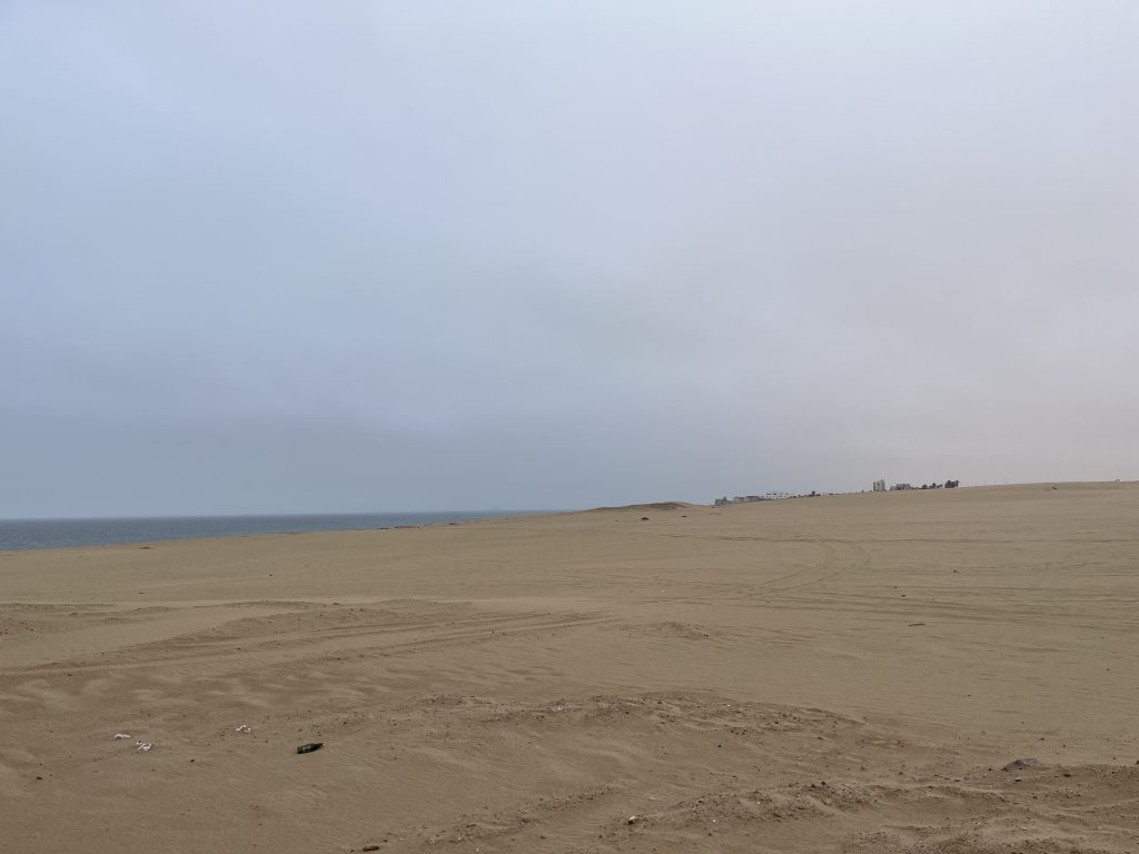 街を出て走っていると、左手にはずっと海外線があります。霧がかかった砂漠の海岸線です。なかなか見られない光景。最後にちょっと車を寄せて写真を撮ってみました。あんまり行きすぎるとスタックしてしまう恐れがあるためご注意を。