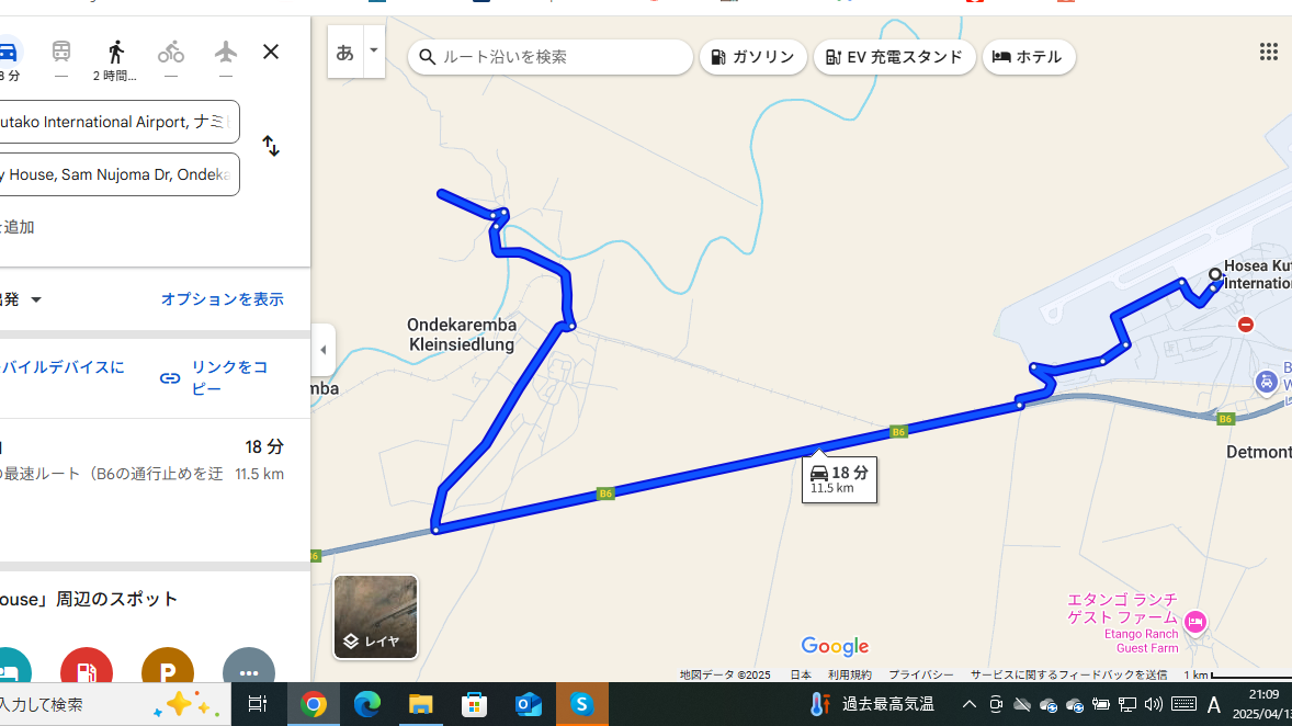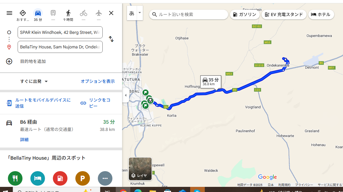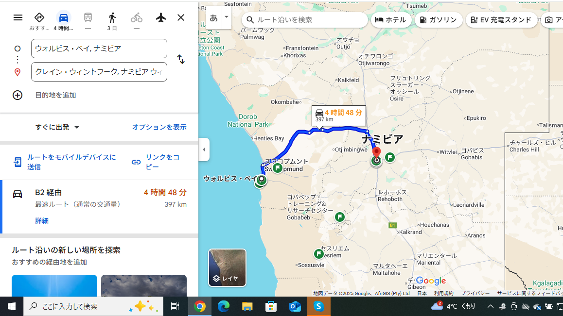 道のりはこんな感じで北にあるスワンコプムントを回ってウィントフックへと向かいます。5時間ほどで着くとのことです。