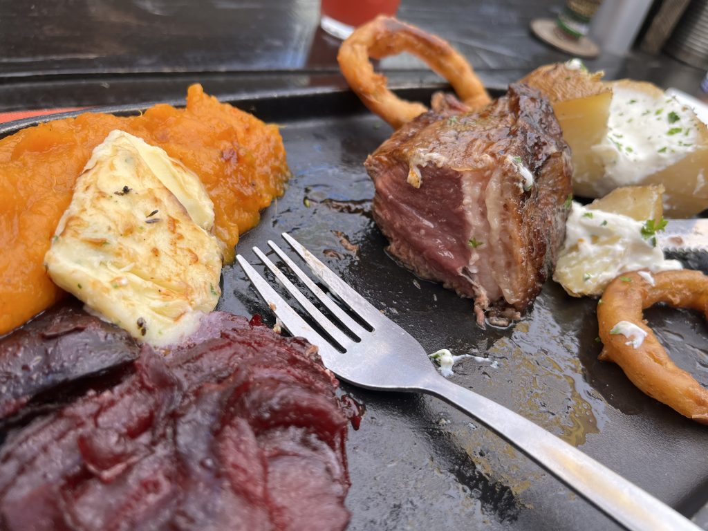 味はうまかったのですが、恐ろしくレアだったので、ナイフで切るのが死ぬほど大変でした。ここまでレアなのはレストランとして問題では?と思いましたが、お腹が減りすぎており、なんでもうまく感じたのでOK。