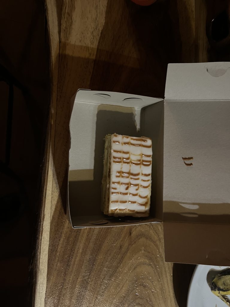 買ってきたバーガーを食べて、そのあと甘々なケーキも食べましたが、とてもお腹がすきました。でも買いにも行けないので、寝ることにします。